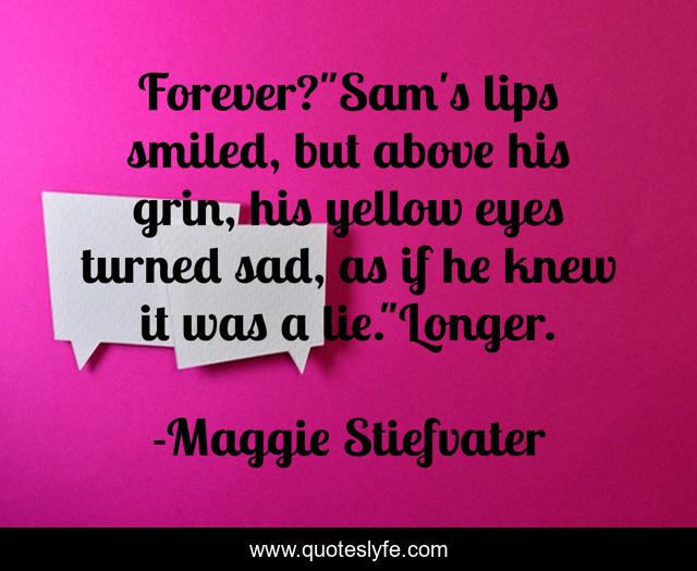 This page presents the quote "Forever?"Sam's lips smiled, but above his grin, his yellow eyes turned sad, as if he knew it was a lie."Longer.". Author of this quote is Maggie Stiefvater. This quote is about love, sam, always, sad, grace, affection,.