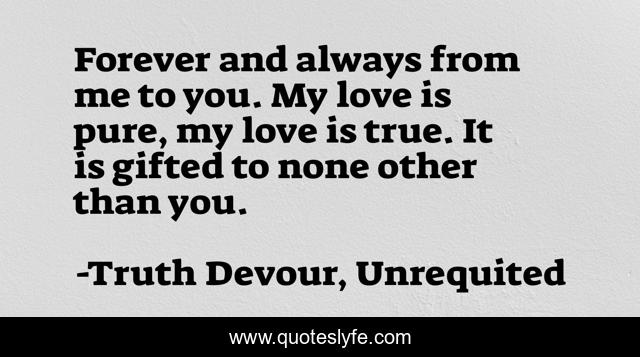 This page presents the quote "Forever and always from me to you. My love is pure, my love is true. It is gifted to none other than you.". Author of this quote is Truth Devour, Unrequited. This quote is about faith, love, kindred-spirits, joy, karmic, soul, romance, twin-flames, sated,.
