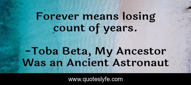 This page presents the quote "Forever means losing count of years.". Author of this quote is Toba Beta, My Ancestor Was an Ancient Astronaut. This quote is about eternity, forever, concept,.