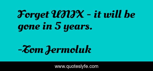 This page presents the quote "Forget UNIX - it will be gone in 5 years.". Author of this quote is Tom Jermoluk. This quote is about humor, computers, technology,.