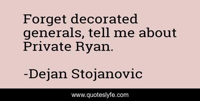 This page presents the quote "Forget decorated generals, tell me about Private Ryan.". Author of this quote is Dejan Stojanovic. This quote is about poets, literature, dejan-stojanovic, philosophy, private-ryan, poetry, wisdom, quotes, generals,.