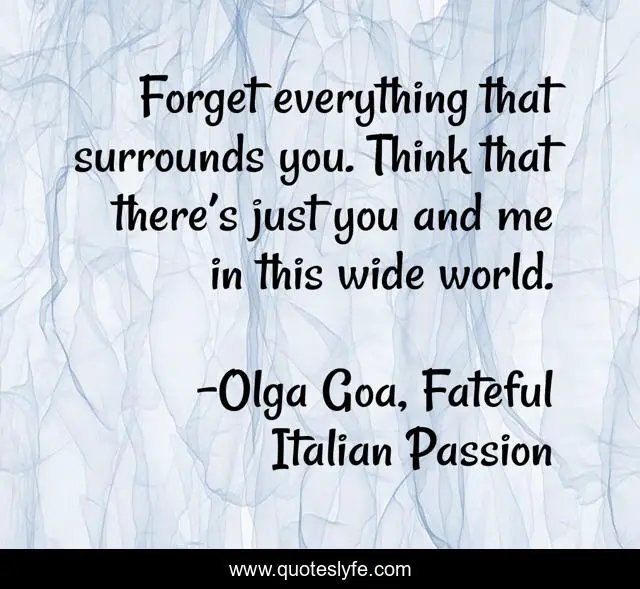 This page presents the quote "Forget everything that surrounds you. Think that there’s just you and me in this wide world.". Author of this quote is Olga Goa, Fateful Italian Passion. This quote is about dark-romance, erotic-romance, love, series, romance, quotes, humor, passion, fateful-italian-passion,.
