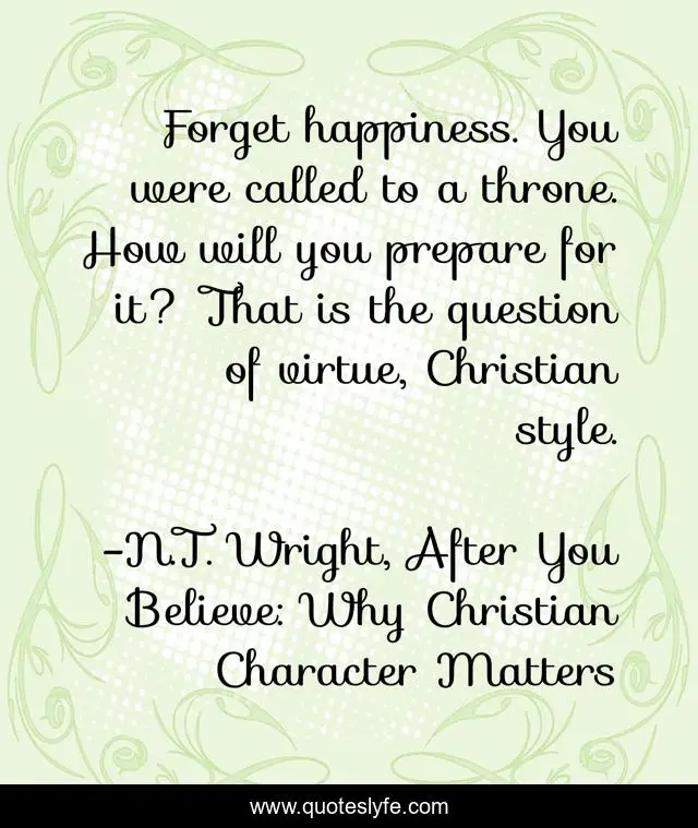 This page presents the quote "Forget happiness. You were called to a throne. How will you prepare for it? That is the question of virtue, Christian style.". Author of this quote is N.T. Wright, After You Believe: Why Christian Character Matters. This quote is about character, virtue, sovereignty-of-god,.