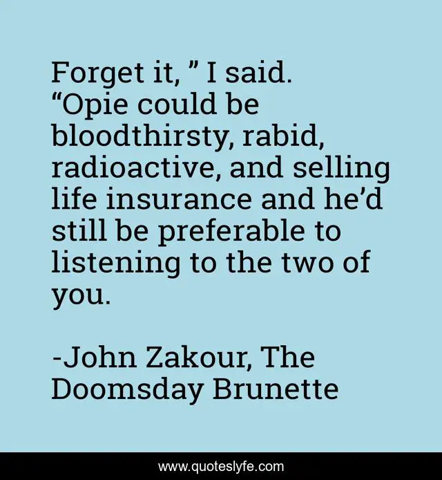 This page presents the quote "Forget it, ” I said. “Opie could be bloodthirsty, rabid, radioactive, and selling life insurance and he’d still be preferable to listening to the two of you.". Author of this quote is John Zakour, The Doomsday Brunette. This quote is about humor, sci-fi-humour-comedy, sci-fi,.