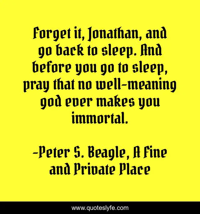 This page presents the quote "Forget it, Jonathan, and go back to sleep. And before you go to sleep, pray that no well-meaning god ever makes you immortal.". Author of this quote is Peter S. Beagle, A Fine and Private Place. This quote is about gods, immortality, sleep, jonathan-rebeck,.