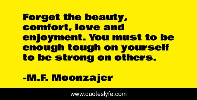 This page presents the quote "Forget the beauty, comfort, love and enjoyment. You must to be enough tough on yourself to be strong on others.". Author of this quote is M.F. Moonzajer. This quote is about love, forget, beauty, enjoyment, comfort, enough, tough, strong, affection,.