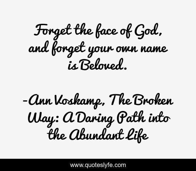 This page presents the quote "Forget the face of God, and forget your own name is Beloved.". Author of this quote is Ann Voskamp, The Broken Way: A Daring Path into the Abundant Life. This quote is about god, christianity, beloved, identity, faith,.