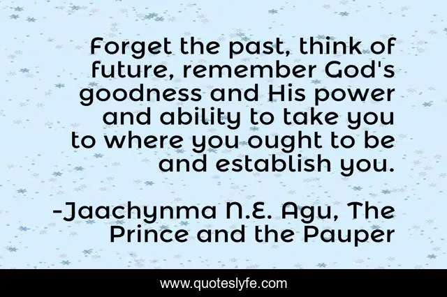 "Jaachynma N.E. Agu, The Prince and the Pauper Quotes." Quoteslyfe.com, 2025. Sat. 06 Dec. 2025. <https://www.quoteslyfe.com/quote/Forget-the-past-think-of-future-remember-255508>.