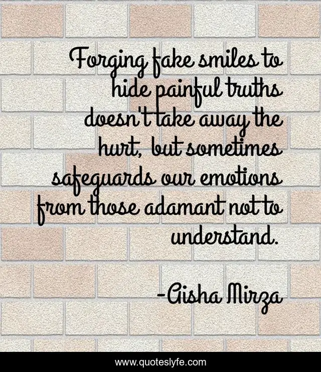 "Aisha Mirza Quotes." Quoteslyfe.com, 2025. Fri. 05 Dec. 2025. <https://www.quoteslyfe.com/quote/Forging-fake-smiles-to-hide-painful-truths-230065>.