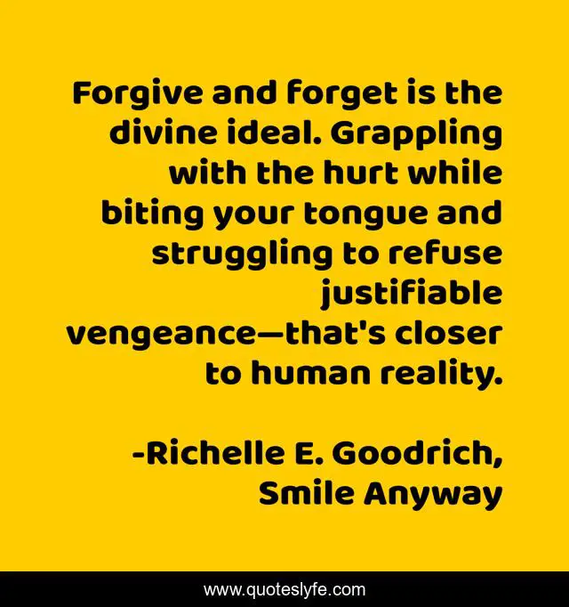 This page presents the quote "Forgive and forget is the divine ideal. Grappling with the hurt while biting your tongue and struggling to refuse justifiable vengeance―that's closer to human reality.". Author of this quote is Richelle E. Goodrich, Smile Anyway. This quote is about acquit, forget, pardon, human-nature, overlook, forgive, revenge, vengeance, spare,.