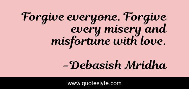 This page presents the quote "Forgive everyone. Forgive every misery and misfortune with love.". Author of this quote is Debasish Mridha. This quote is about love, philosophy, debasish-mridha, forgive, quotes, inspirational, misery, enthusiasm, forgiveness,.