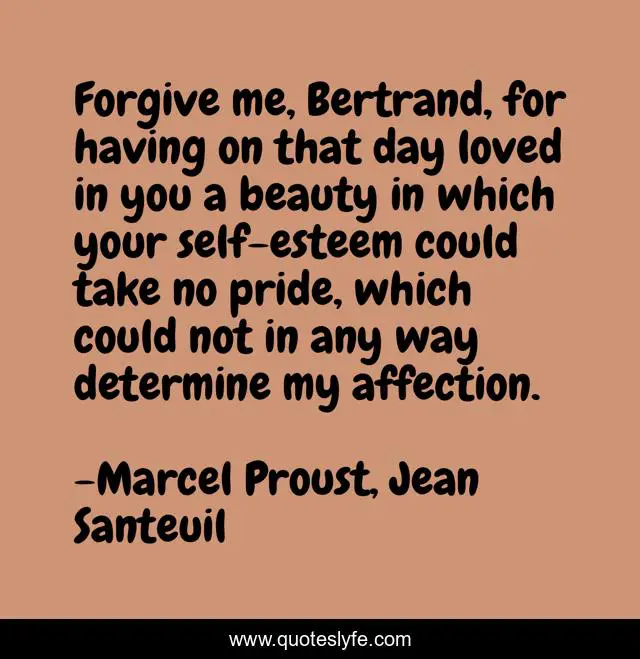 This page presents the quote "Forgive me, Bertrand, for having on that day loved in you a beauty in which your self-esteem could take no pride, which could not in any way determine my affection.". Author of this quote is Marcel Proust, Jean Santeuil. This quote is about pride, love, affection, self-esteem,.