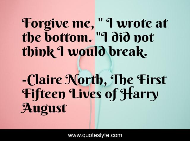 This page presents the quote "Forgive me, " I wrote at the bottom. "I did not think I would break.". Author of this quote is Claire North, The First Fifteen Lives of Harry August. This quote is about heart, life, mind, sad, break, inspirational, enthusiasm, mental-illness,.