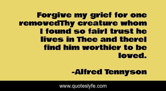 This page presents the quote "Forgive my grief for one removedThy creature whom I found so fairI trust he lives in Thee and thereI find him worthier to be loved.". Author of this quote is Alfred Tennyson. This quote is about grief, love-faith-in-god,.