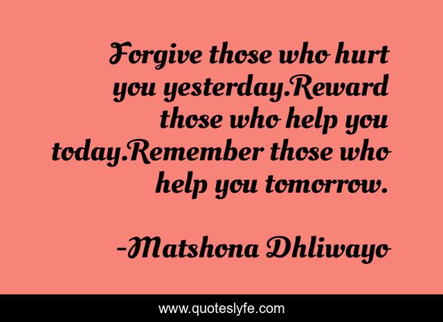 "Matshona Dhliwayo Quotes." Quoteslyfe.com, 2025. Sun. 07 Dec. 2025. <https://www.quoteslyfe.com/quote/Forgive-those-who-hurt-you-yesterday-Reward-57685>.