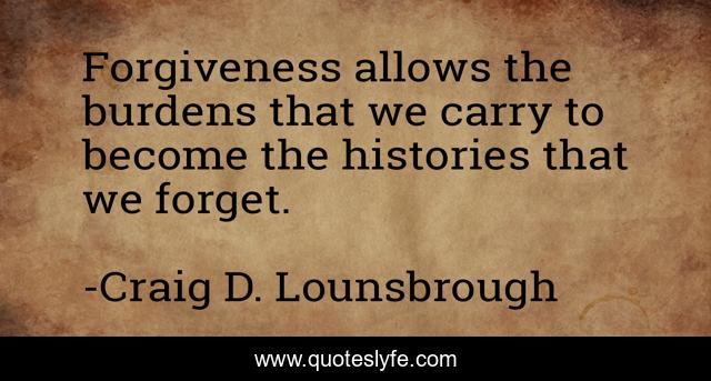 This page presents the quote "Forgiveness allows the burdens that we carry to become the histories that we forget.". Author of this quote is Craig D. Lounsbrough. This quote is about jesus-christ, christian, forget, weight, god, forgive, christianity, burden, history,.
