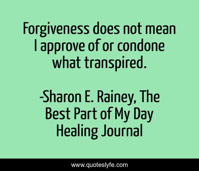 This page presents the quote "Forgiveness does not mean I approve of or condone what transpired.". Author of this quote is Sharon E. Rainey, The Best Part of My Day Healing Journal. This quote is about forgiveness, healing-insights, transpire, condone, approve, event,.