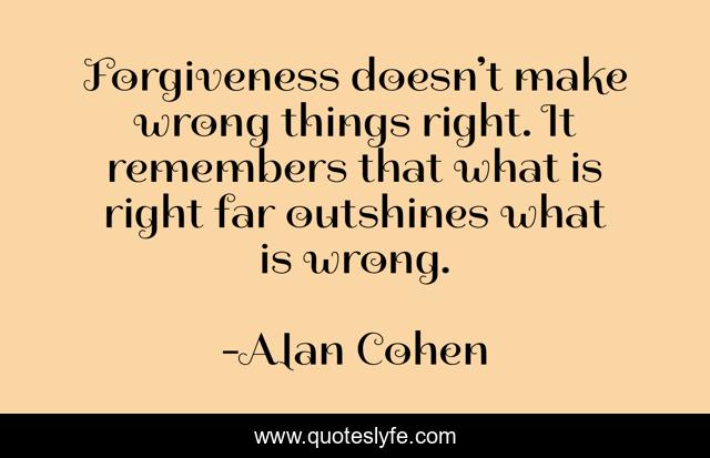 "Alan Cohen Quotes." Quoteslyfe.com, 2025. Fri. 05 Dec. 2025. <https://www.quoteslyfe.com/quote/Forgiveness-doesn-t-make-wrong-things-right-121911>.