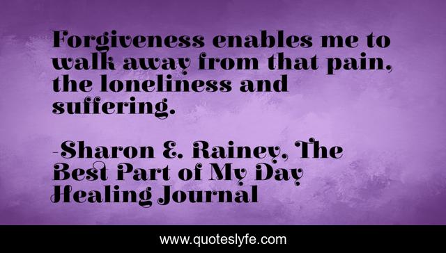 This page presents the quote "Forgiveness enables me to walk away from that pain, the loneliness and suffering.". Author of this quote is Sharon E. Rainey, The Best Part of My Day Healing Journal. This quote is about forgiveness, loneliness, walk-away, pain, suffering,.