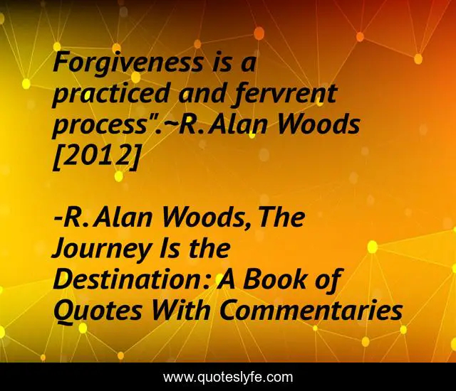 This page presents the quote "Forgiveness is a practiced and fervrent process".~R. Alan Woods [2012]". Author of this quote is R. Alan Woods, The Journey Is the Destination: A Book of Quotes With Commentaries. This quote is about forgiveness, r-alan-woods,.