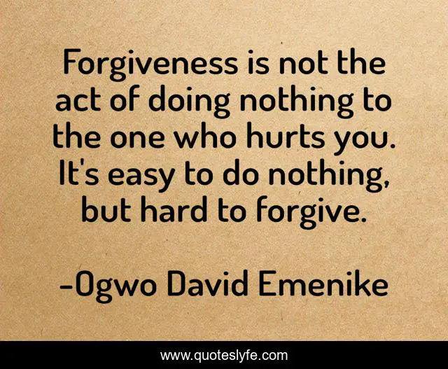 This page presents the quote "Forgiveness is not the act of doing nothing to the one who hurts you. It's easy to do nothing, but hard to forgive.". Author of this quote is Ogwo David Emenike. This quote is about forgiveness, forgive, hurt,.