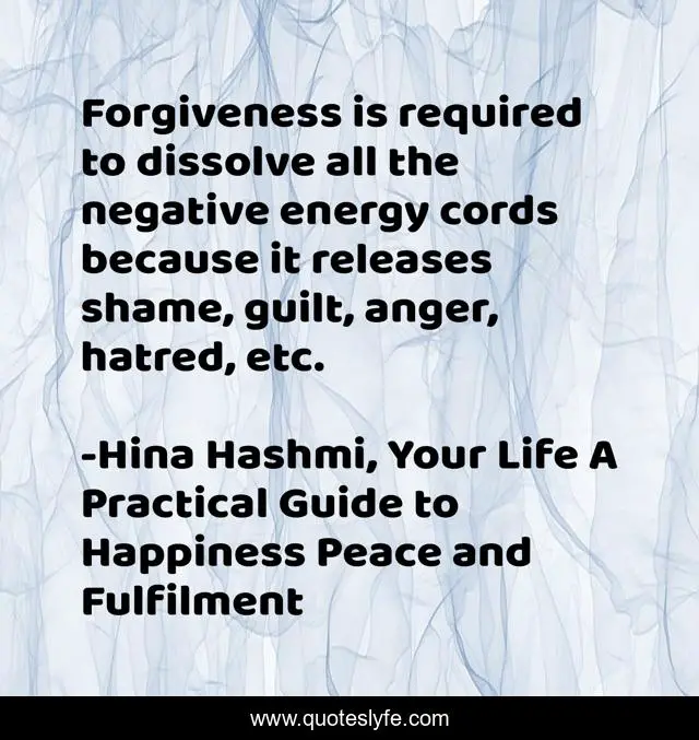 This page presents the quote "Forgiveness is required to dissolve all the negative energy cords because it releases shame, guilt, anger, hatred, etc.". Author of this quote is Hina Hashmi, Your Life A Practical Guide to Happiness Peace and Fulfilment. This quote is about negative-emotions, energy-healing, forgiveness,.