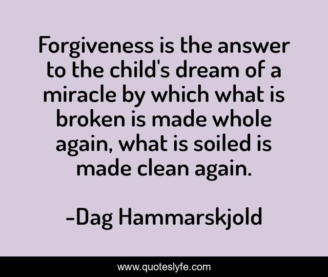 This page presents the quote "Forgiveness is the answer to the child's dream of a miracle by which what is broken is made whole again, what is soiled is made clean again.". Author of this quote is Dag Hammarskjold. This quote is about broken, dream, child,.