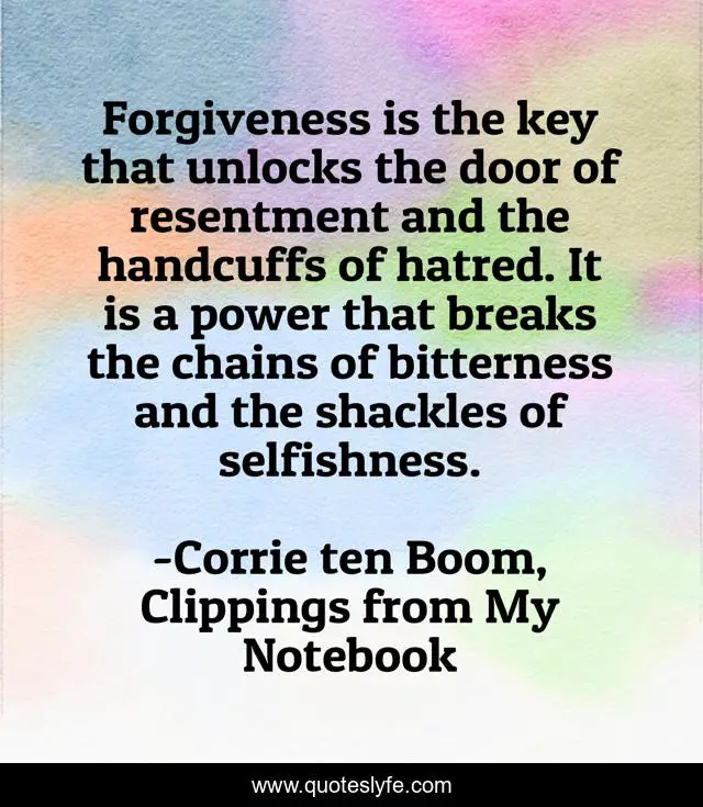 This page presents the quote "Forgiveness is the key that unlocks the door of resentment and the handcuffs of hatred. It is a power that breaks the chains of bitterness and the shackles of selfishness.". Author of this quote is Corrie ten Boom, Clippings from My Notebook. .