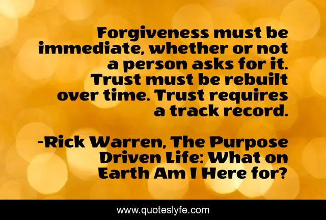 This page presents the quote "Forgiveness must be immediate, whether or not a person asks for it. Trust must be rebuilt over time. Trust requires a track record.". Author of this quote is Rick Warren, The Purpose Driven Life: What on Earth Am I Here for?. This quote is about trust, forgiveness,.