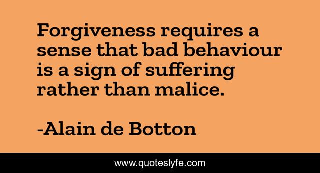 This page presents the quote "Forgiveness requires a sense that bad behaviour is a sign of suffering rather than malice.". Author of this quote is Alain de Botton. This quote is about bad-behavior, suffering, forgiveness, malice, understanding,.