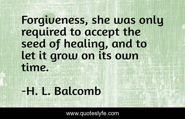 This page presents the quote "Forgiveness, she was only required to accept the seed of healing, and to let it grow on its own time.". Author of this quote is H. L. Balcomb. This quote is about dream, love, afterlife, peace, forgiveness, possibility, potential, healing, now,.