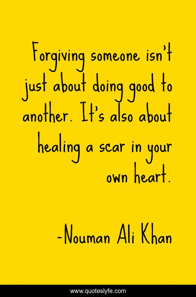 This page presents the quote "Forgiving someone isn't just about doing good to another. It's also about healing a scar in your own heart.". Author of this quote is Nouman Ali Khan. This quote is about characteristics, forgiveness,.