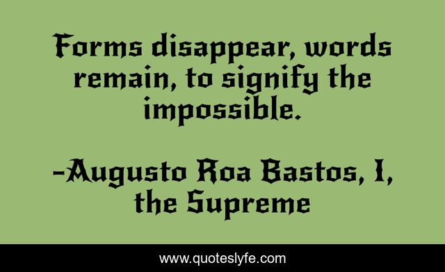 This page presents the quote "Forms disappear, words remain, to signify the impossible.". Author of this quote is Augusto Roa Bastos, I, the Supreme. This quote is about content, form, words,.
