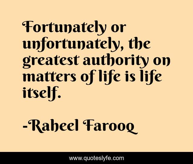 This page presents the quote "Fortunately or unfortunately, the greatest authority on matters of life is life itself.". Author of this quote is Raheel Farooq. This quote is about religion, life, philosophy, authority,.