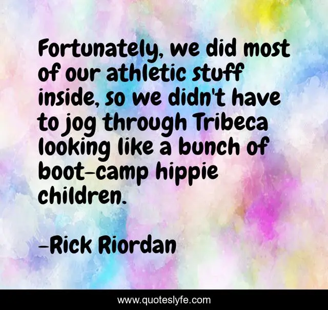 This page presents the quote "Fortunately, we did most of our athletic stuff inside, so we didn't have to jog through Tribeca looking like a bunch of boot-camp hippie children.". Author of this quote is Rick Riordan. .