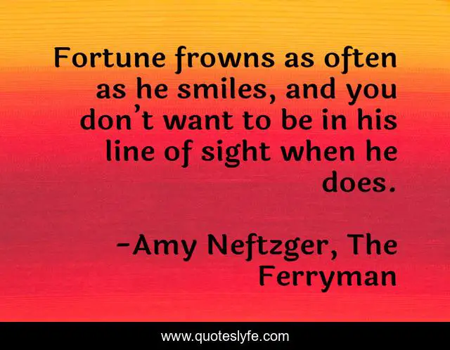 This page presents the quote "Fortune frowns as often as he smiles, and you don’t want to be in his line of sight when he does.". Author of this quote is Amy Neftzger, The Ferryman. This quote is about bad-luck, fortune, luck,.