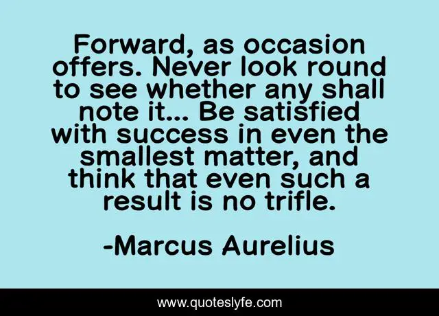 This page presents the quote "Forward, as occasion offers. Never look round to see whether any shall note it... Be satisfied with success in even the smallest matter, and think that even such a result is no trifle.". Author of this quote is Marcus Aurelius. This quote is about see, think, look,.