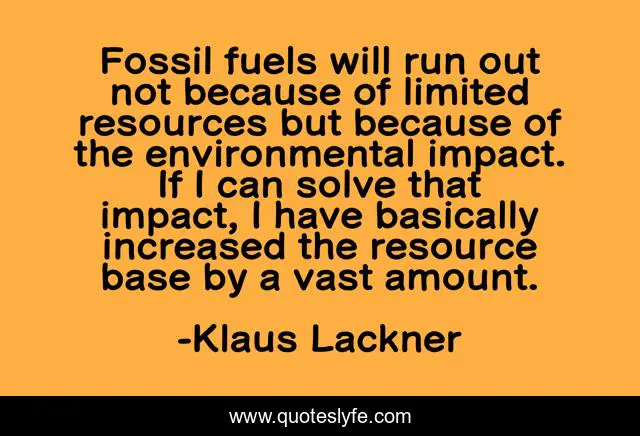 This page presents the quote "Fossil fuels will run out not because of limited resources but because of the environmental impact. If I can solve that impact, I have basically increased the resource base by a vast amount.". Author of this quote is Klaus Lackner. This quote is about impact, run, resources,.