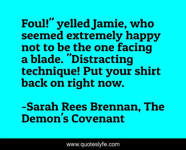This page presents the quote "Foul!" yelled Jamie, who seemed extremely happy not to be the one facing a blade. "Distracting technique! Put your shirt back on right now.". Author of this quote is Sarah Rees Brennan, The Demon's Covenant. This quote is about funny, comedy,.