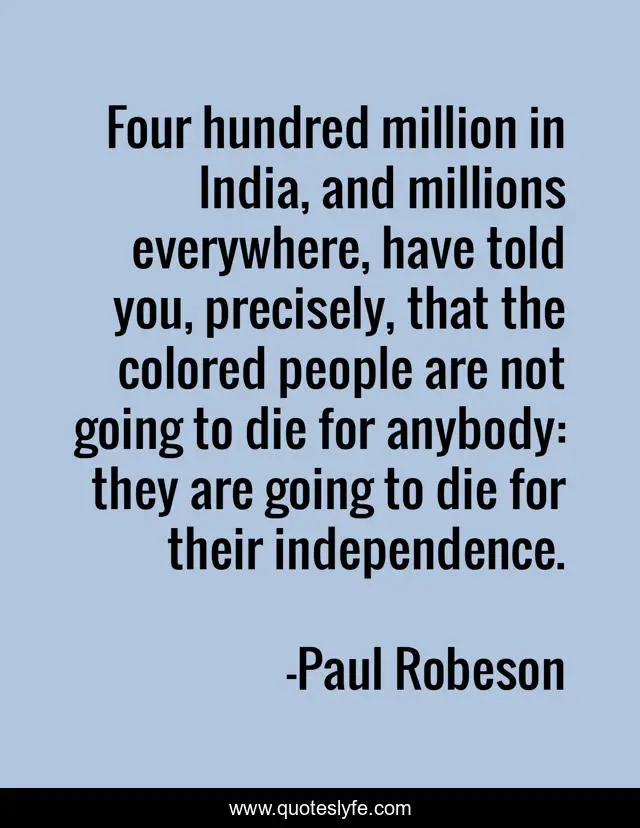 This page presents the quote "Four hundred million in India, and millions everywhere, have told you, precisely, that the colored people are not going to die for anybody: they are going to die for their independence.". Author of this quote is Paul Robeson. This quote is about die, people,.