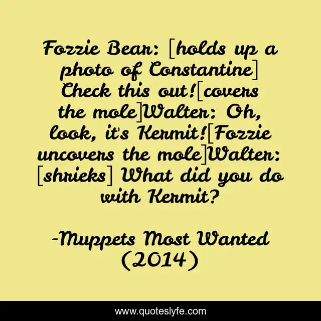 This page presents the quote "Fozzie Bear: [holds up a photo of Constantine] Check this out![covers the mole]Walter: Oh, look, it's Kermit![Fozzie uncovers the mole]Walter: [shrieks] What did you do with Kermit?". Author of this quote is Muppets Most Wanted (2014). This quote is about film-script, comedy, film,.