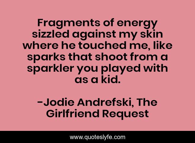 This page presents the quote "Fragments of energy sizzled against my skin where he touched me, like sparks that shoot from a sparkler you played with as a kid.". Author of this quote is Jodie Andrefski, The Girlfriend Request. This quote is about ya, first-love,.