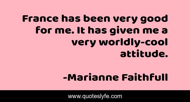 This page presents the quote "France has been very good for me. It has given me a very worldly-cool attitude.". Author of this quote is Marianne Faithfull. This quote is about me, good, france,.