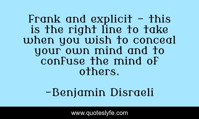 This page presents the quote "Frank and explicit - this is the right line to take when you wish to conceal your own mind and to confuse the mind of others.". Author of this quote is Benjamin Disraeli. .