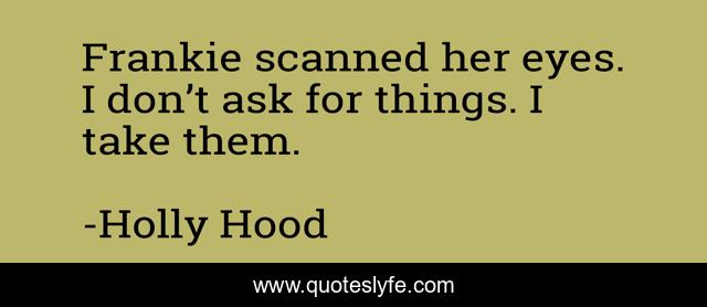 This page presents the quote "Frankie scanned her eyes. I don’t ask for things. I take them.". Author of this quote is Holly Hood. This quote is about love, affection, love-hurts,.