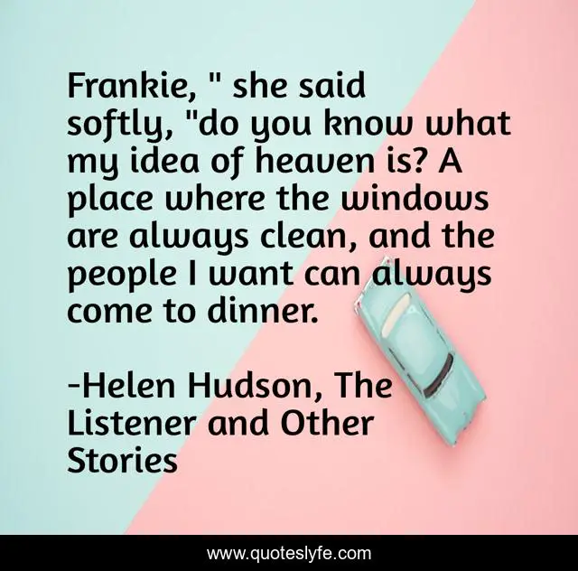 This page presents the quote "Frankie, " she said softly, "do you know what my idea of heaven is? A place where the windows are always clean, and the people I want can always come to dinner.". Author of this quote is Helen Hudson, The Listener and Other Stories. This quote is about aging, first-world-problems, loneliness, end-of-life-issues,.