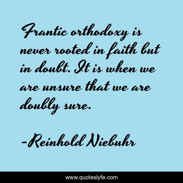 This page presents the quote "Frantic orthodoxy is never rooted in faith but in doubt. It is when we are unsure that we are doubly sure.". Author of this quote is Reinhold Niebuhr. This quote is about faith, doubt, religion,.