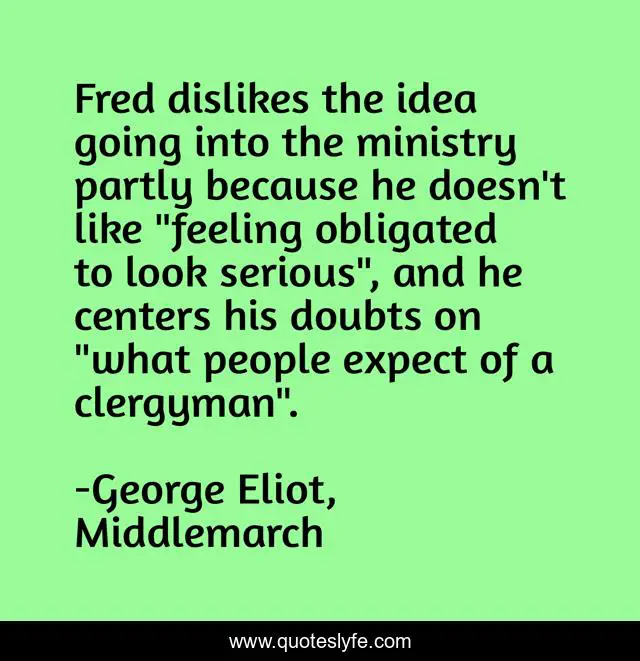 This page presents the quote "Fred dislikes the idea going into the ministry partly because he doesn't like "feeling obligated to look serious", and he centers his doubts on "what people expect of a clergyman".". Author of this quote is George Eliot, Middlemarch. This quote is about joy, popularity, ministry,.