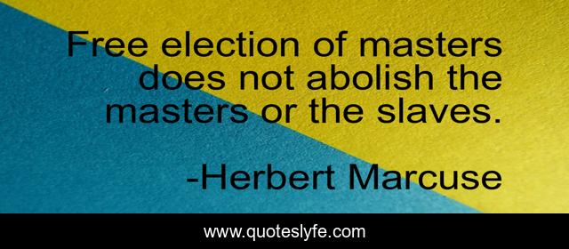 This page presents the quote "Free election of masters does not abolish the masters or the slaves.". Author of this quote is Herbert Marcuse. This quote is about government, radicalism, elections, domination, subjugation, freedom, representative-democracy,.