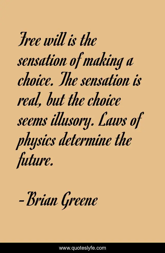 This page presents the quote "Free will is the sensation of making a choice. The sensation is real, but the choice seems illusory. Laws of physics determine the future.". Author of this quote is Brian Greene. This quote is about science, free-will, illusory, laws-of-physics, choice, determinism, physics, materialism,.